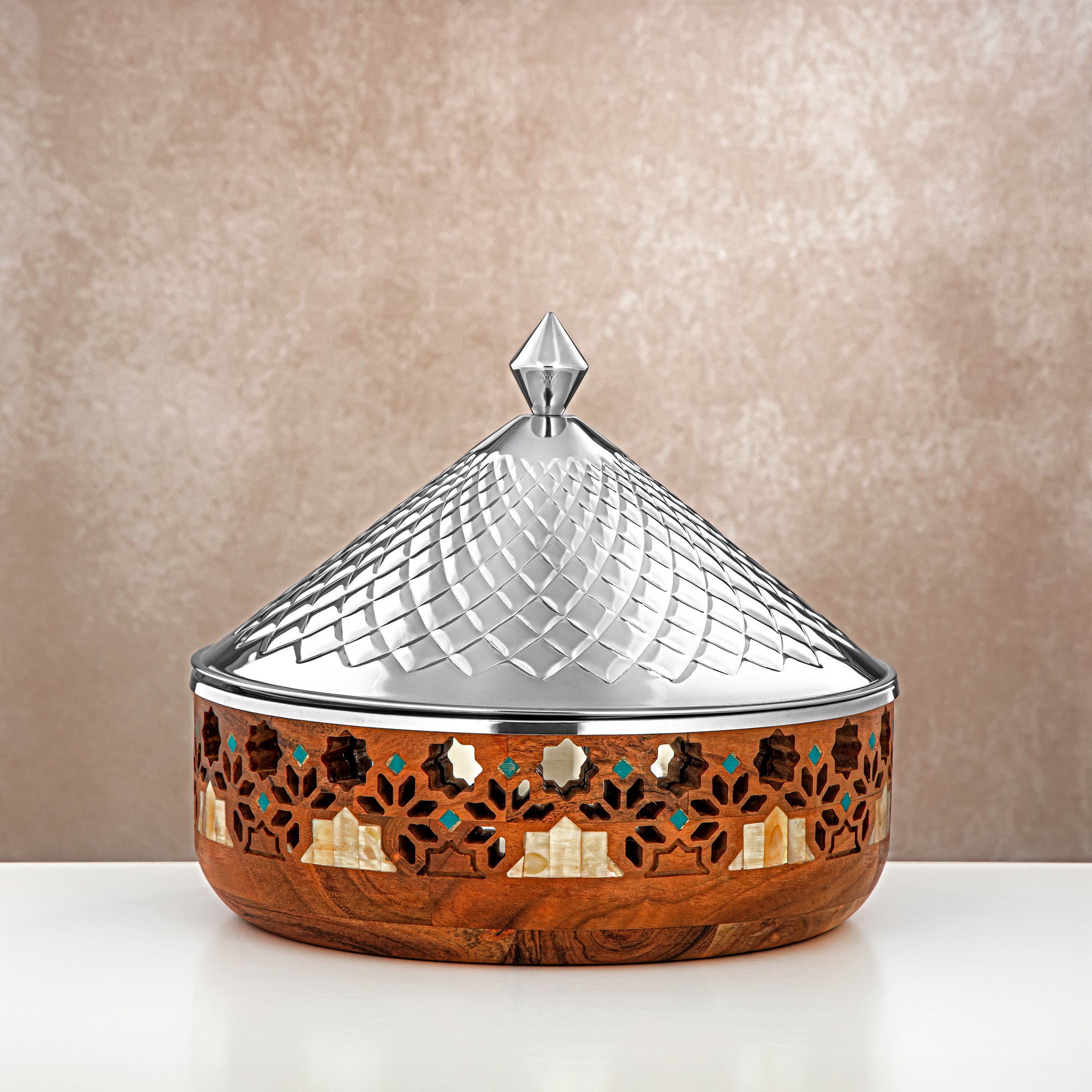 نقدم لكم تصميم وعاء التسخين الفاخر من المرجان، والذي يتميز بمزيج فريد من الاستانلس ستيل المقاوم للصدأ والخشب، مزين بنقوش خشبية بارزة و غائرة وتفاصيل من عرق اللؤلؤ. يحافظ الوعاء الساخن بسعة 2500 مل على طعامك ساخناً وطازجاً لساعات طويلة. مثالي لتقديم الطعام في التجمعات والمناسبات الخاصة، يضيف هذا الوعاء الساخن لمسة من الأناقة والرقي إلى تجربة تناول الطعام الخاصة بك.